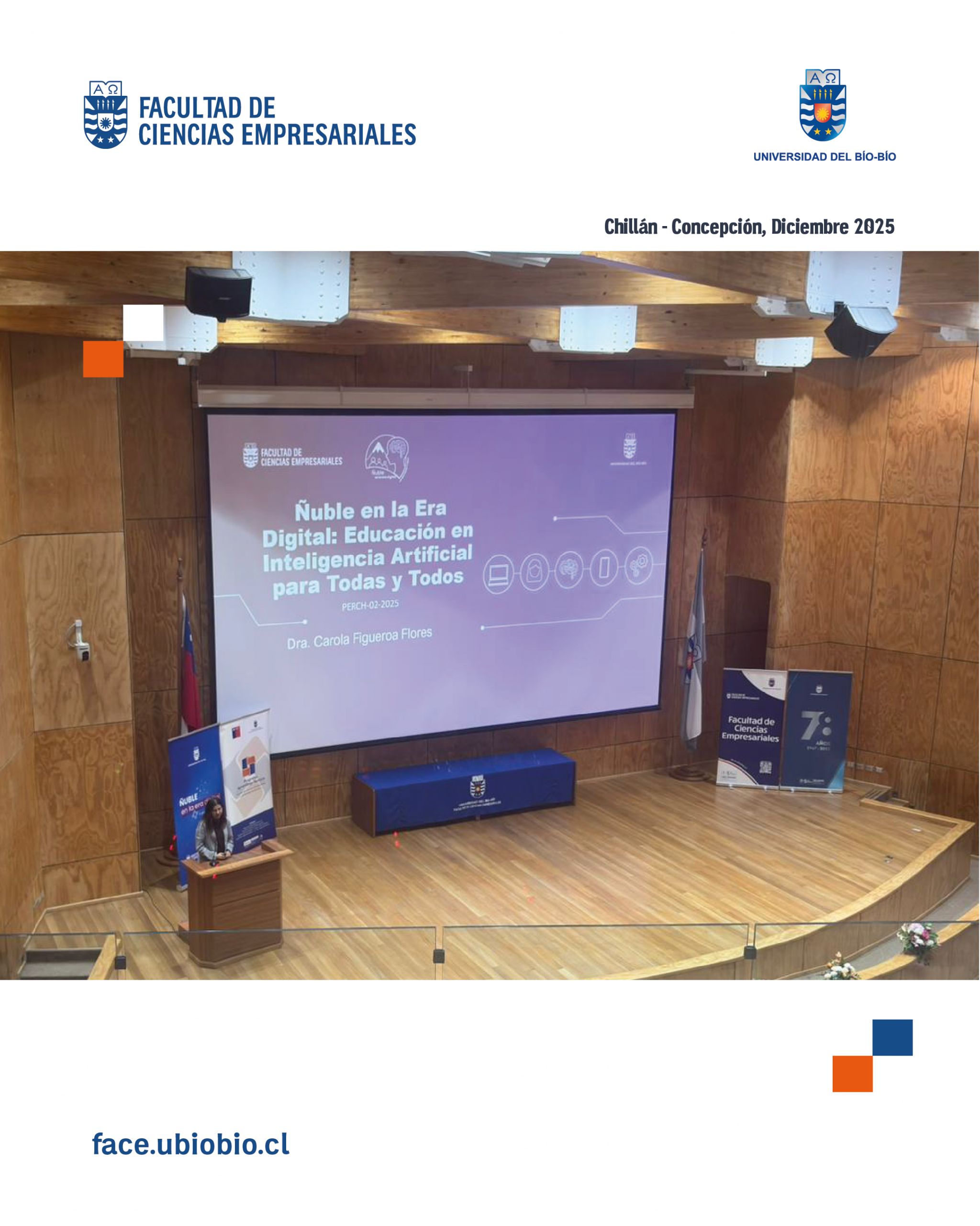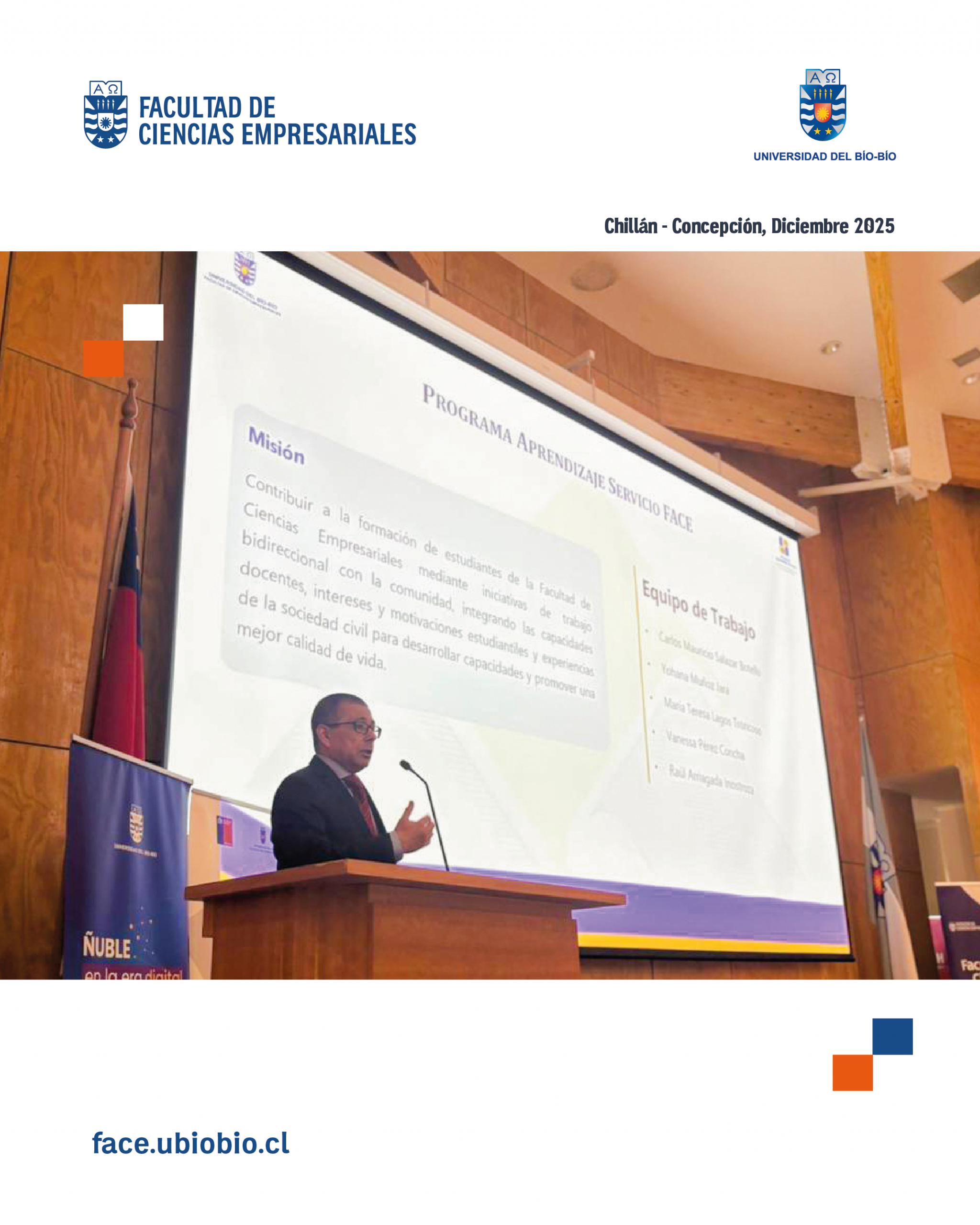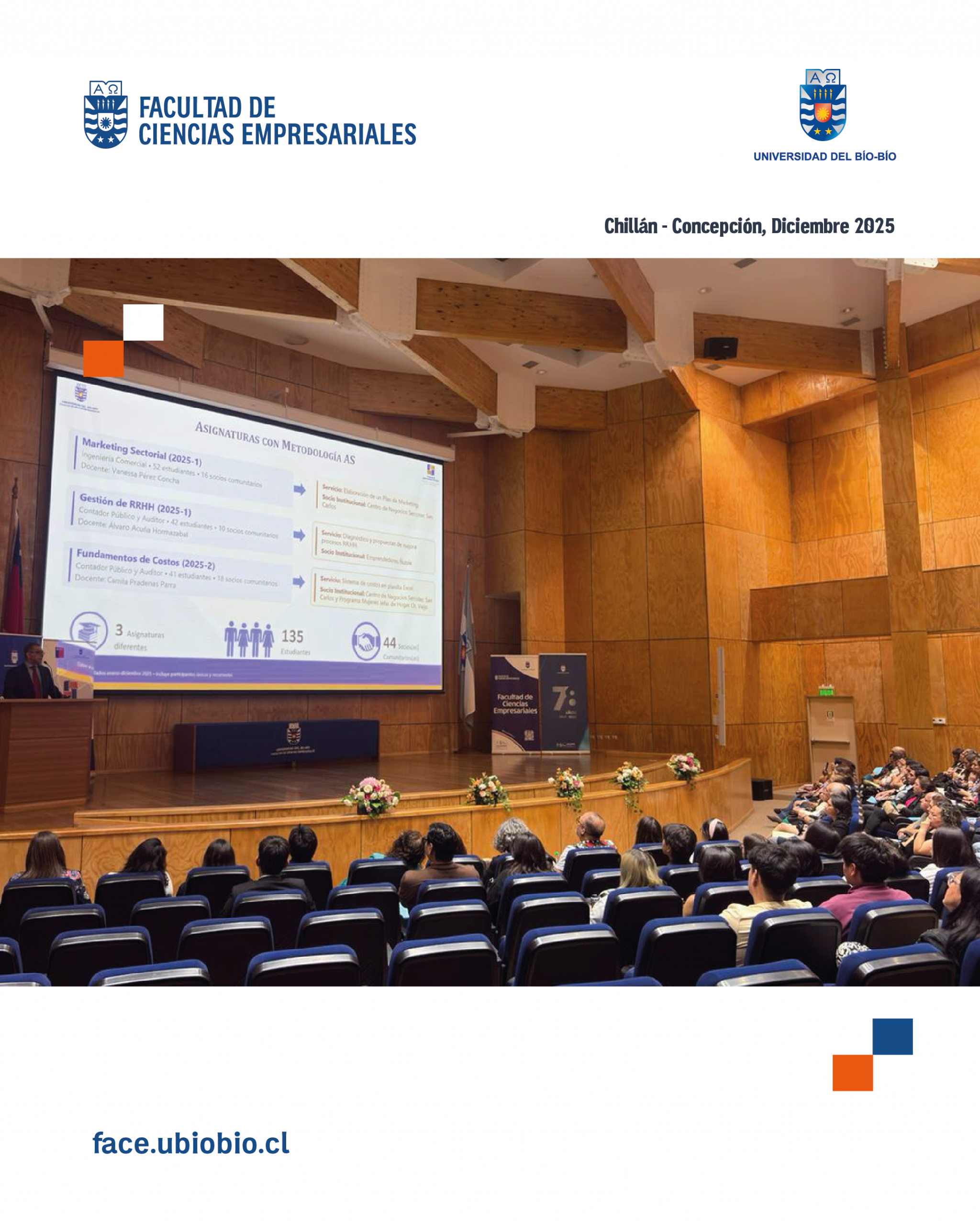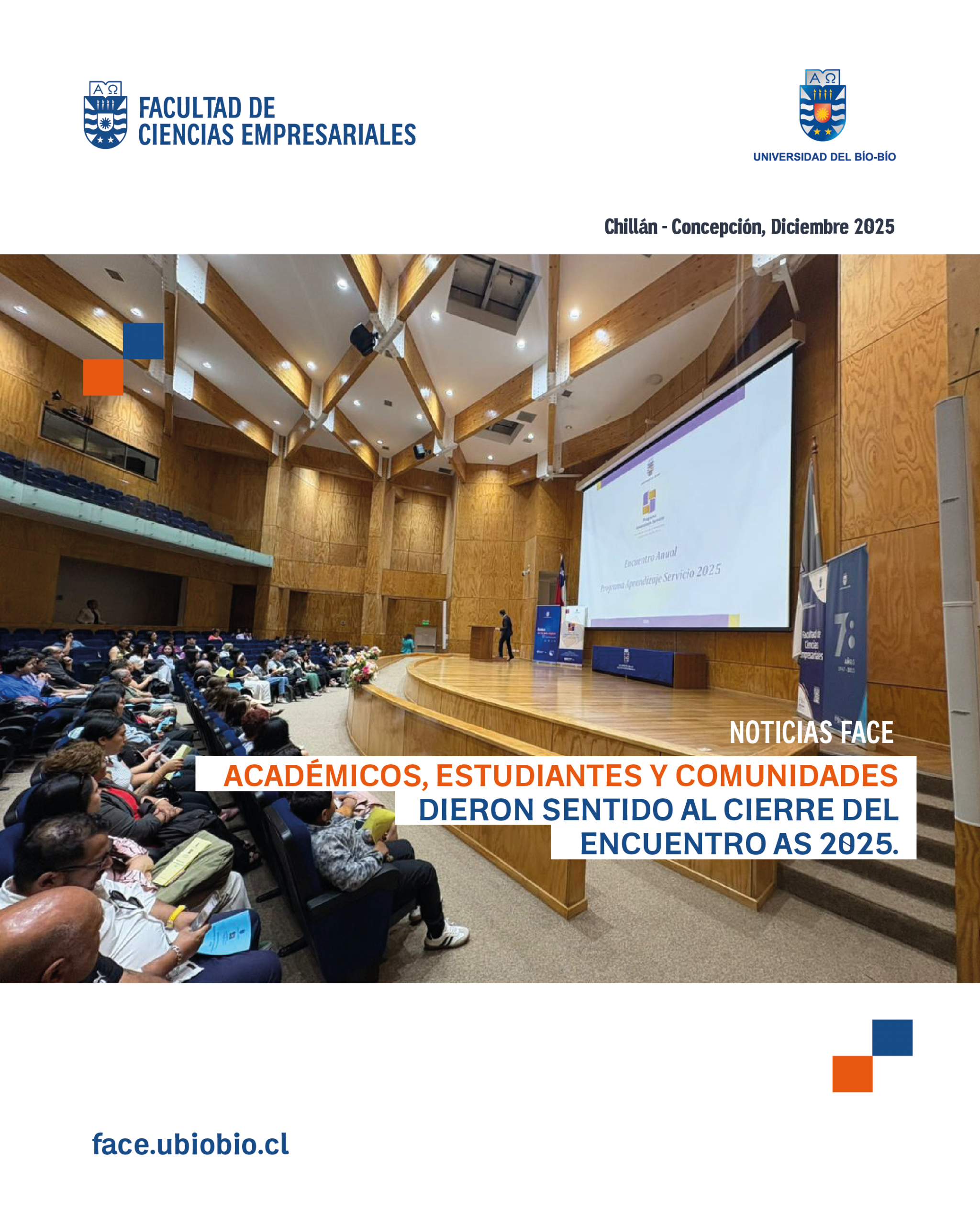 El Aula Magna del Campus Fernando May fue el espacio donde la Facultad de Ciencias Empresariales de la Universidad del Bío-Bío realizó el Encuentro Anual 2025 del Programa de Aprendizaje Servicio (AS), reuniendo a autoridades universitarias, docentes, estudiantes, emprendedores y socios comunitarios de diversas comunas de Ñuble.