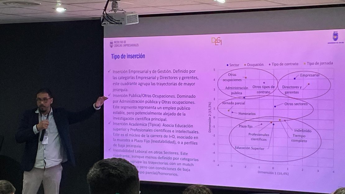 En esta ocasión, Julio César actuó como comentarista en la sesión dedicada al papel de las patentes en México como capital simbólico. Asimismo, Julio César presentó los avances de su investigación doctoral que busca analizar los factores que inciden en la inserción laboral de personas con doctorado en Chile, a partir de los datos de la Encuesta de Trayectoria de Profesionales con Doctorado (2021). Para ello, se aplicó un análisis de correspondencia múltiple, que permitió elaborar mapas conceptuales y representar relaciones de proximidad y oposición entre distintas categorías de variables. Esta constituye la primera etapa de un artículo de investigación doctoral en desarrollo orientado a identificar perfiles de inserción profesional de los doctores en el país.